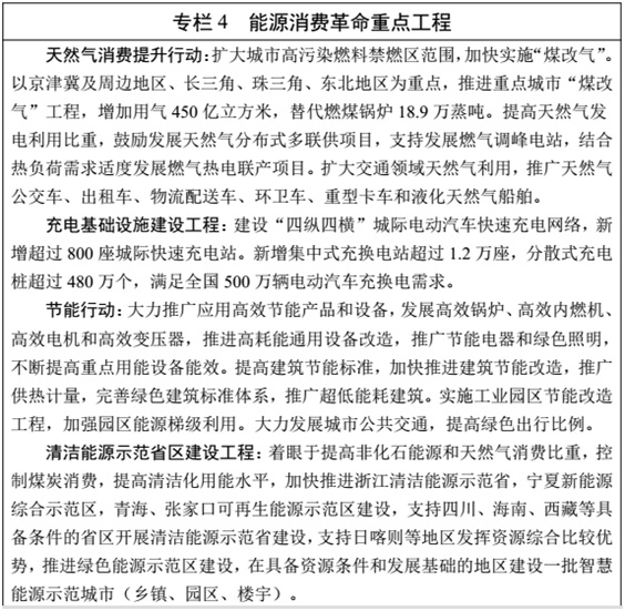 實施電能替代工程。 積極推進(jìn)居民生活、 工業(yè)與農(nóng)業(yè)生產(chǎn)、 交通運(yùn)輸?shù)阮I(lǐng)域電能替代。 推廣電鍋爐、 電窯爐、 電采暖等新型用能方式, 以京津冀及周邊地區(qū)為重點, 加快推進(jìn)農(nóng)村采暖電能替代, 在新能源富集地區(qū)利用低谷富余電實施儲能供暖。 提高鐵路電氣化率, 適度超前建設(shè)電動汽車充電設(shè)施, 大力發(fā)展港口岸電、 機(jī)場橋電系統(tǒng), 促進(jìn)交通運(yùn)輸“ 以電代油” 。 到 2020 年電能在終端能源消費中的比重提高到27%以上。