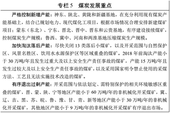 ——煤炭。 嚴(yán)格控制審批新建煤礦項目、 新增產(chǎn)能技術(shù)改造項目和生產(chǎn)能力核增項目, 確需新建煤礦的, 實行減量置換。 運(yùn)用市場化手段以及安全、 環(huán)保、 技術(shù)、 質(zhì)量等標(biāo)準(zhǔn),加快淘汰落后產(chǎn)能和不符合產(chǎn)業(yè)政策的產(chǎn)能, 積極引導(dǎo)安全無保障、 資源枯竭、 賦存條件差、 環(huán)境污染重、 長期虧損的煤礦產(chǎn)能有序退出, 推進(jìn)企業(yè)兼并重組, 鼓勵煤、 電、 化等上下游產(chǎn)業(yè)一體化經(jīng)營。 實行煤炭產(chǎn)能登記公告制度, 嚴(yán)格治理違法違規(guī)煤礦項目建設(shè), 控制超能力生產(chǎn)。 “ 十三五”期間, 停緩建一批在建煤礦項目, 14 個大型煤炭基地生產(chǎn)能力達(dá)到全國的 95%以上。