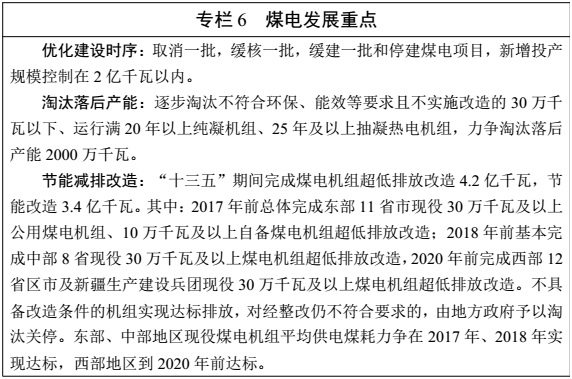 ——煤電。 優(yōu)化規(guī)劃建設(shè)時序, 加快淘汰落后產(chǎn)能, 促進(jìn)煤電清潔高效發(fā)展。 建立煤電規(guī)劃建設(shè)風(fēng)險預(yù)警機(jī)制, 加強(qiáng)煤電利用小時數(shù)監(jiān)測和考核, 與新上項目規(guī)模掛鉤, 合理調(diào)控建設(shè)節(jié)奏。 “ 十三五” 前兩年暫緩核準(zhǔn)電力盈余省份中除民生熱電和扶貧項目之外的新建自用煤電項目, 采取有力措施提高存量機(jī)組利用率, 使全國煤電機(jī)組平均利用小時數(shù)達(dá)到合理水平; 后三年根據(jù)供需形勢, 按照國家總量控制要求, 合理確定新增煤電規(guī)模, 有序安排項目開工和投產(chǎn)時序。民生熱電聯(lián)產(chǎn)項目以背壓式機(jī)組為主。 提高煤電能耗、 環(huán)保等準(zhǔn)入標(biāo)準(zhǔn), 加快淘汰落后產(chǎn)能, 力爭關(guān)停 2000 萬千瓦。2020 年煤電裝機(jī)規(guī)模力爭控制在 11 億千瓦以內(nèi)。