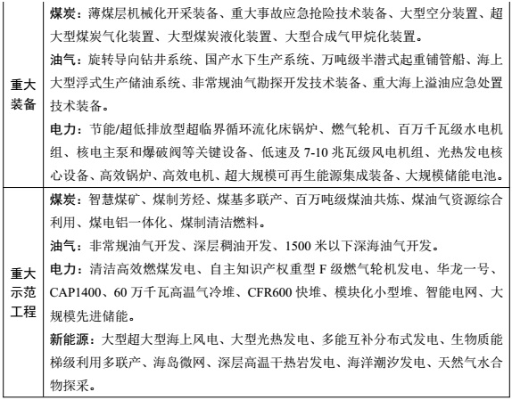 加強(qiáng)重點領(lǐng)域能源裝備自主創(chuàng)新, 重點突破能源裝備制造關(guān)鍵技術(shù)、 材料和零部件等瓶頸, 加快形成重大裝備自主成套能力, 推動可再生能源上游制造業(yè)加快智能制造升級, 提升全產(chǎn)業(yè)鏈發(fā)展質(zhì)量和效益。實施科技創(chuàng)新示范工程。 發(fā)揮我國能源市場空間大、 工程實踐機(jī)會多的優(yōu)勢, 加大資金、 政策扶持力度, 重點在油氣勘探開發(fā)、 煤炭加工轉(zhuǎn)化、 高效清潔發(fā)電、 新能源開發(fā)利用、 智能電網(wǎng)、 先進(jìn)核電、 大規(guī)模儲能、 柔性直流輸電、 制氫等領(lǐng)域, 建設(shè)一批創(chuàng)新示范工程, 推動先進(jìn)產(chǎn)能建設(shè), 提高能源科技自主創(chuàng)新能力和裝備制造國產(chǎn)化水平。