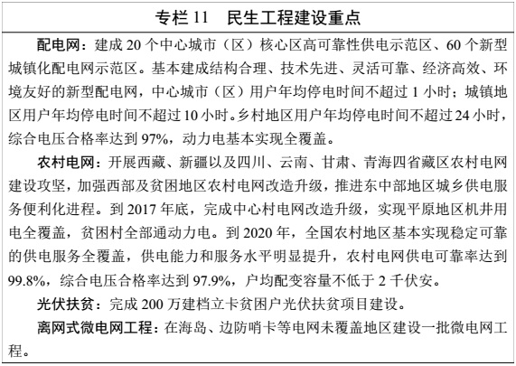 ——電網(wǎng)。 堅持分層分區(qū)、 結(jié)構(gòu)清晰、 安全可控、 經(jīng)濟(jì)高效的發(fā)展原則, 充分論證全國同步電網(wǎng)格局, 進(jìn)一步調(diào)整完善電網(wǎng)主網(wǎng)架。 根據(jù)目標(biāo)市場落實情況, 穩(wěn)步推進(jìn)跨省區(qū)電力輸送通道建設(shè), 合理確定通道送電規(guī)模。 有序建設(shè)大氣污染防治重點輸電通道, 積極推進(jìn)大型水電基地外送通道建設(shè), 優(yōu)先解決云南、 四川棄水和東北地區(qū)窩電問題。 探索建立靈活可調(diào)節(jié)的跨區(qū)輸電價格形成機(jī)制, 優(yōu)化電力資源配置。 進(jìn)一步優(yōu)化完善區(qū)域和省級電網(wǎng)主網(wǎng)架, 充分挖掘既有電網(wǎng)輸送潛力, 示范應(yīng)用柔性直流輸電, 加快突破電網(wǎng)平衡和自適應(yīng)等運(yùn)行控制技術(shù), 著力提升電網(wǎng)利用效率。 加大投資力度, 全面實施城鄉(xiāng)配電網(wǎng)建設(shè)改造行動, 打造現(xiàn)代配電網(wǎng), 鼓勵具備條件地區(qū)開展多能互補(bǔ)集成優(yōu)化的微電網(wǎng)示范應(yīng)用。 “ 十三五” 期間新增跨省區(qū)輸電能力 1.3 億千瓦左右。