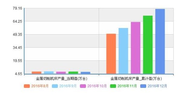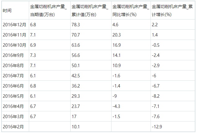 2016年12月我國金屬切削機床產量當期值6.8萬臺,累計產量78.3萬臺,產量同比增長4.6%,累計增長2.2%。