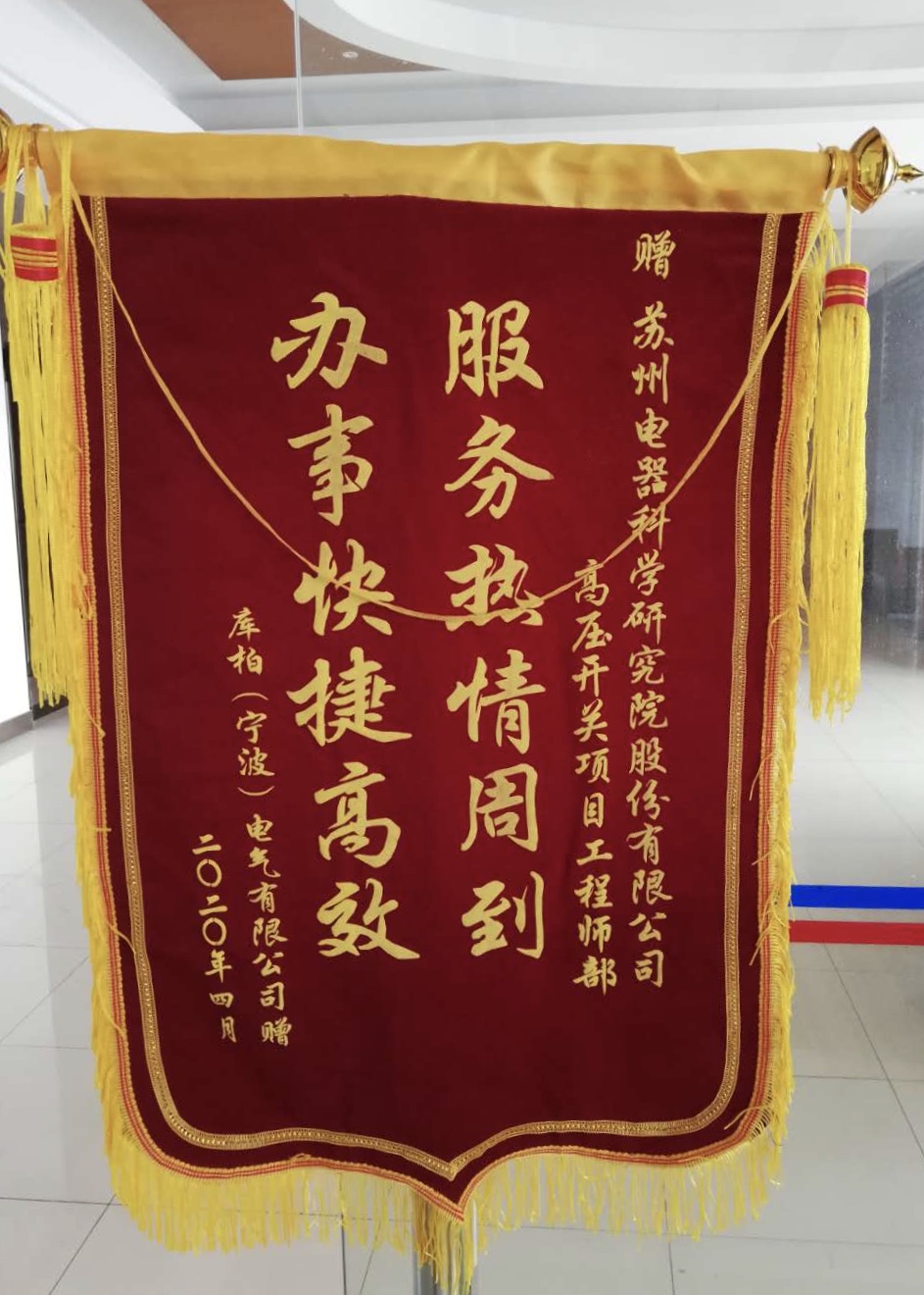 近日,庫柏(寧波)電氣有限公司將寫有“服務熱情周到 辦事快捷高效”的錦旗送到了蘇州電科院高壓開關項目部,對于疫情期間測試工程師提供的高效、優(yōu)質的服務表示由衷的感謝。
