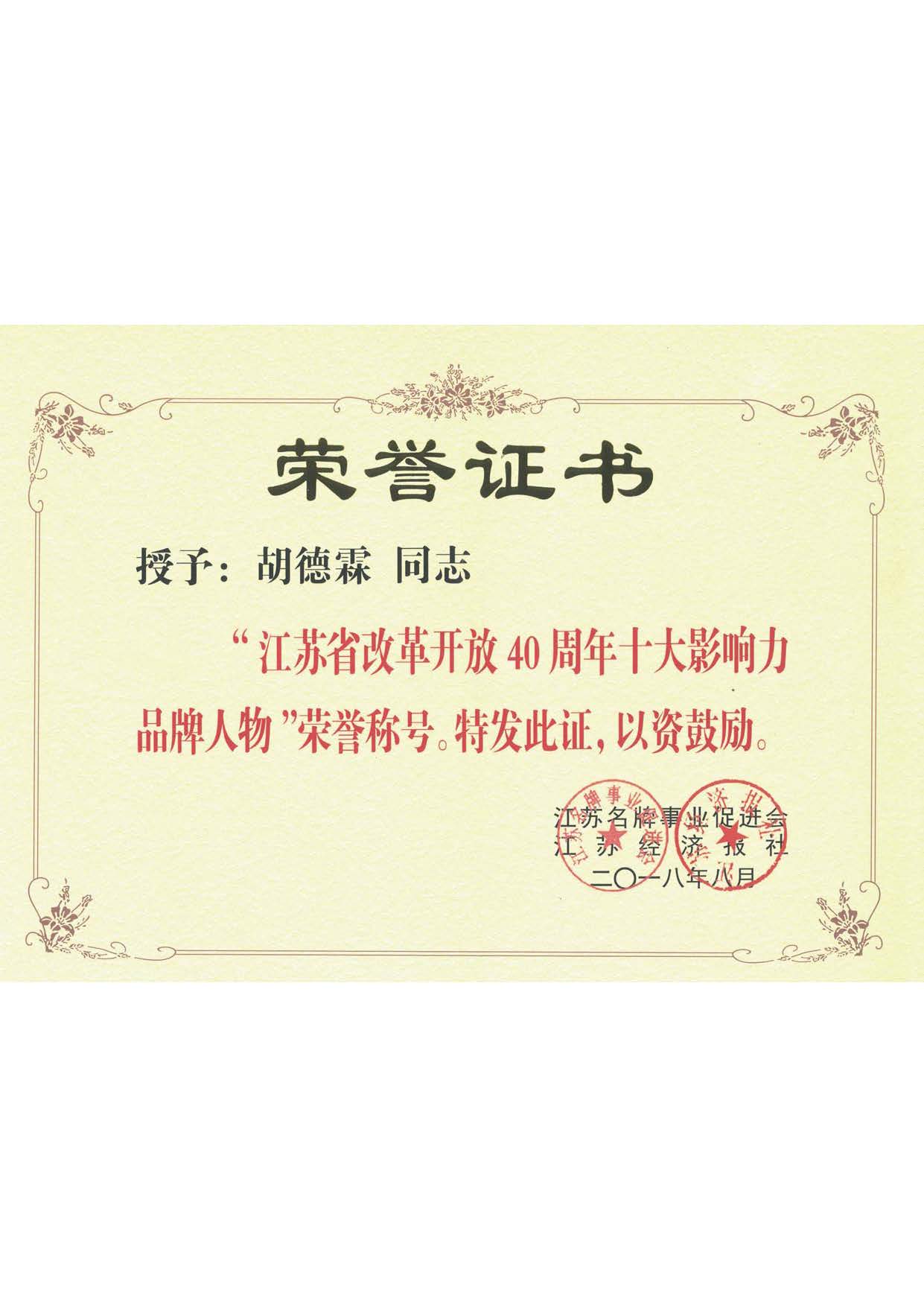 • Top ten influential brand people in Jiangsu Province in the 40th anniversary of reform and opening-up(Certificate)